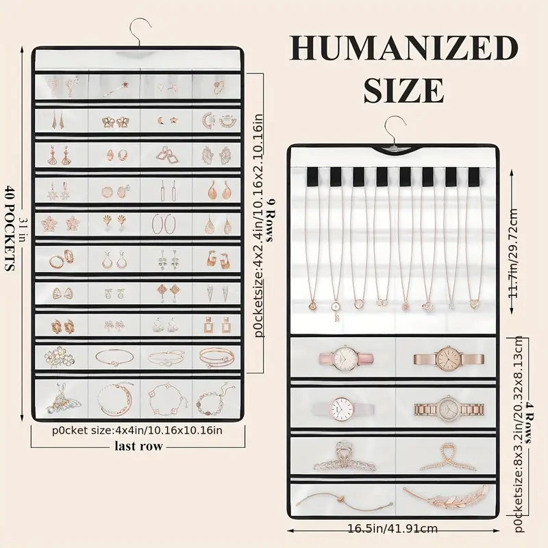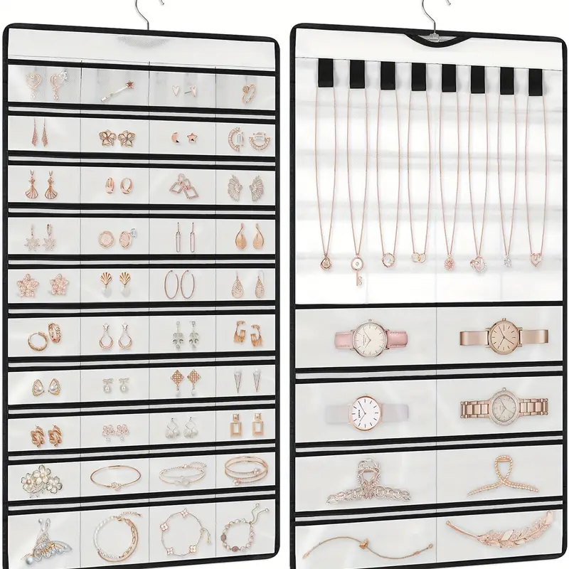 سازماندهنده جواهرات آویز دو طرفه یک راه حل عالی برای نگهداری و سازماندهی جواهرات و لوازم جانبی شماست. با ۴۸ جیب شفاف، میتوانید به راحتی گوشوارهها، گردنبندها، حلقهها، دستبندها و ساعتهای خود را مرتب کنید و در هر زمان به آنها دسترسی سریع داشته باشید.